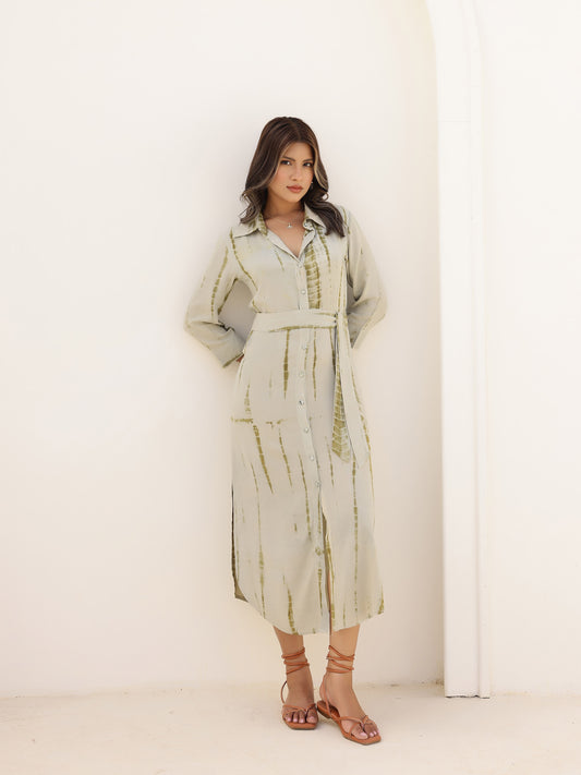 Green Shibori Tie Dye Fitted Side Slit Shirt Dress