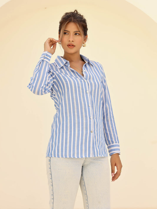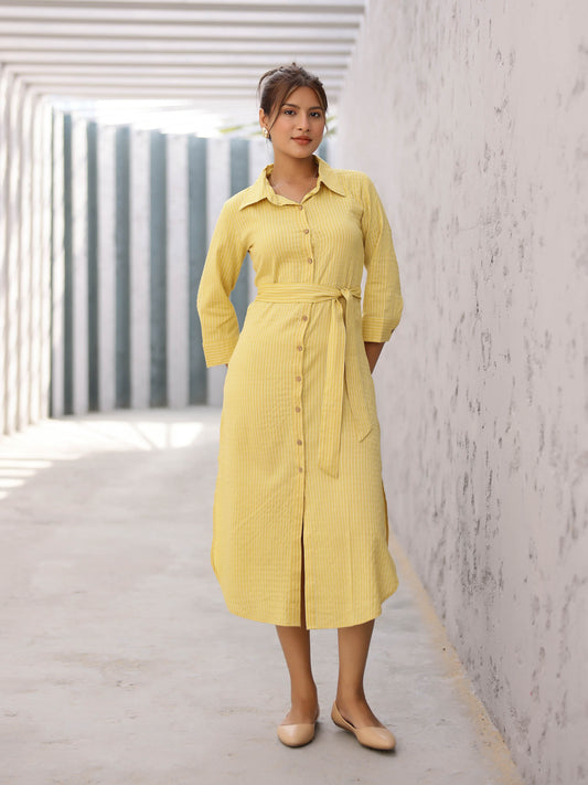 Yellow Striped Design Fitted Side Slit Shirt Dress