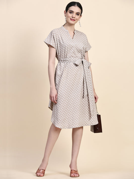 Brown Band Collar Oversized V Neck Belted Knee Dress