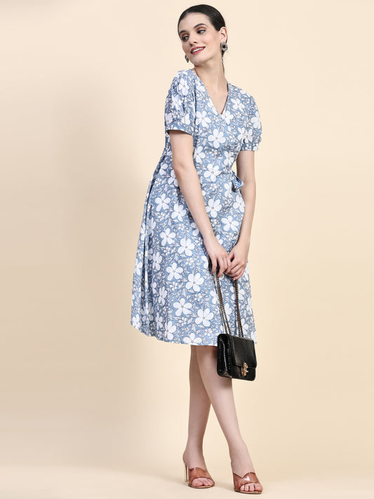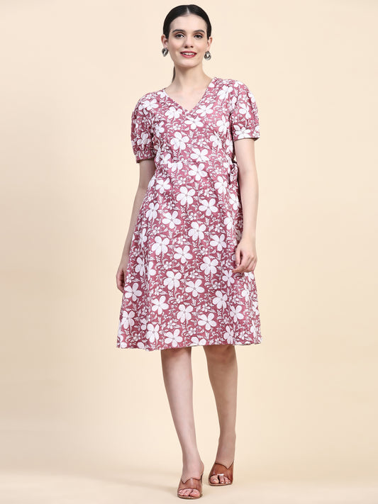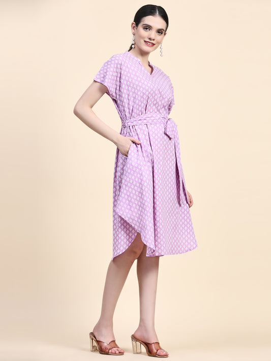 Lavender Band Collar Oversized V Neck Belted Knee Dress